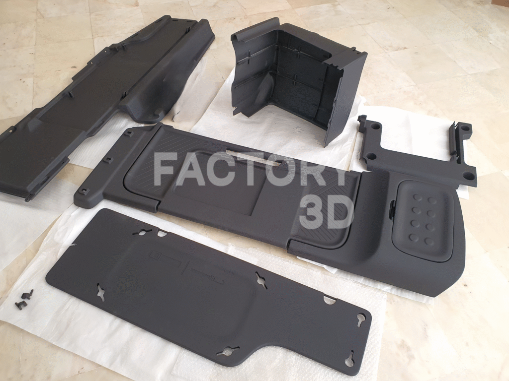 Ensemble de pièces intérieures réalisé en fabrication additive pour valider l’ergonomie, les interfaces d’assemblage et l’intégration de nouveaux aménagements.