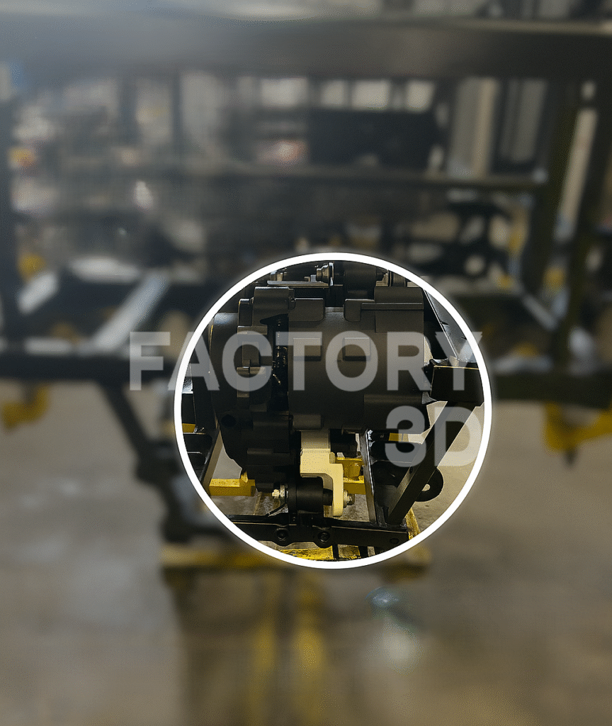 Prototype fonctionnel réalisé en fabrication additive afin de vérifier le positionnement et la cinématique d’un ensemble monté sur châssis.